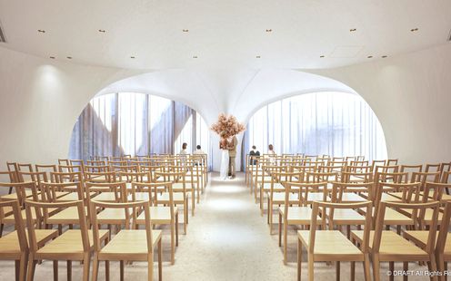 アーチを描く天井と大きな窓から差し込む自然光が、空間全体を心地よく包み込む優しい空間。挙式前には、家族だけで過ごすファミリーセレモニーという特別な時間を設けています。また、スタッフとの打合せで見えてきた、ふたりの人生ヒストリーを1つの映像として上映したり、ゲストから「はなむけの言葉」が贈られたり、心に残る感動的なひとときを体験できます。※チャペル全景、完成予想図