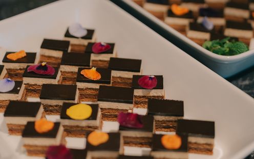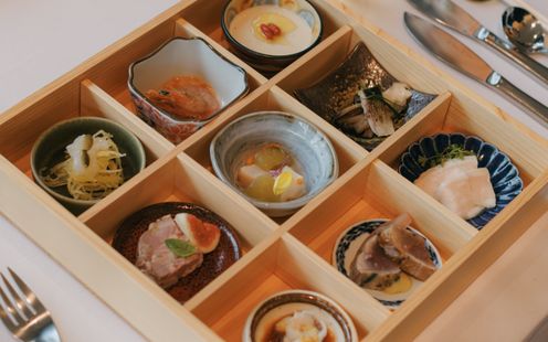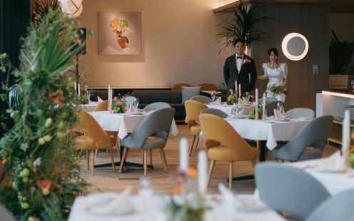フランスで研鑽を積んだシェフがハレの日にふさわしい品々でおもてなし致します。全国の生産者から届く旬の食材をふんだんに使用したフランス料理に和のエッセンスを取り入れた独創的な「和魂洋菜キュイジーヌ」はどんな年代のゲストにも好評。いつものレストランの味をそのままウエディングメニューとしてご提供できるのも特徴です。伝統的な松花堂箱にてご提供する前菜『SHOKADO-9』は華やかで晴れの日にふさわしい一皿として人気です。