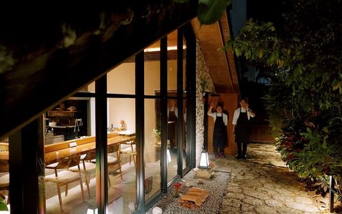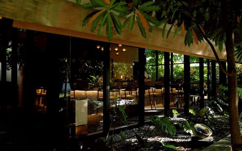 ホテル ストレータ那覇の中庭を通り抜けると現れる、静かに佇む離れのレストラン。沖縄の自然に囲まれた穏やかな雰囲気と、都会の喧騒を忘れさせる非日常感が魅力です。ゆいレール美栄橋駅から徒歩30秒とアクセスも良好。