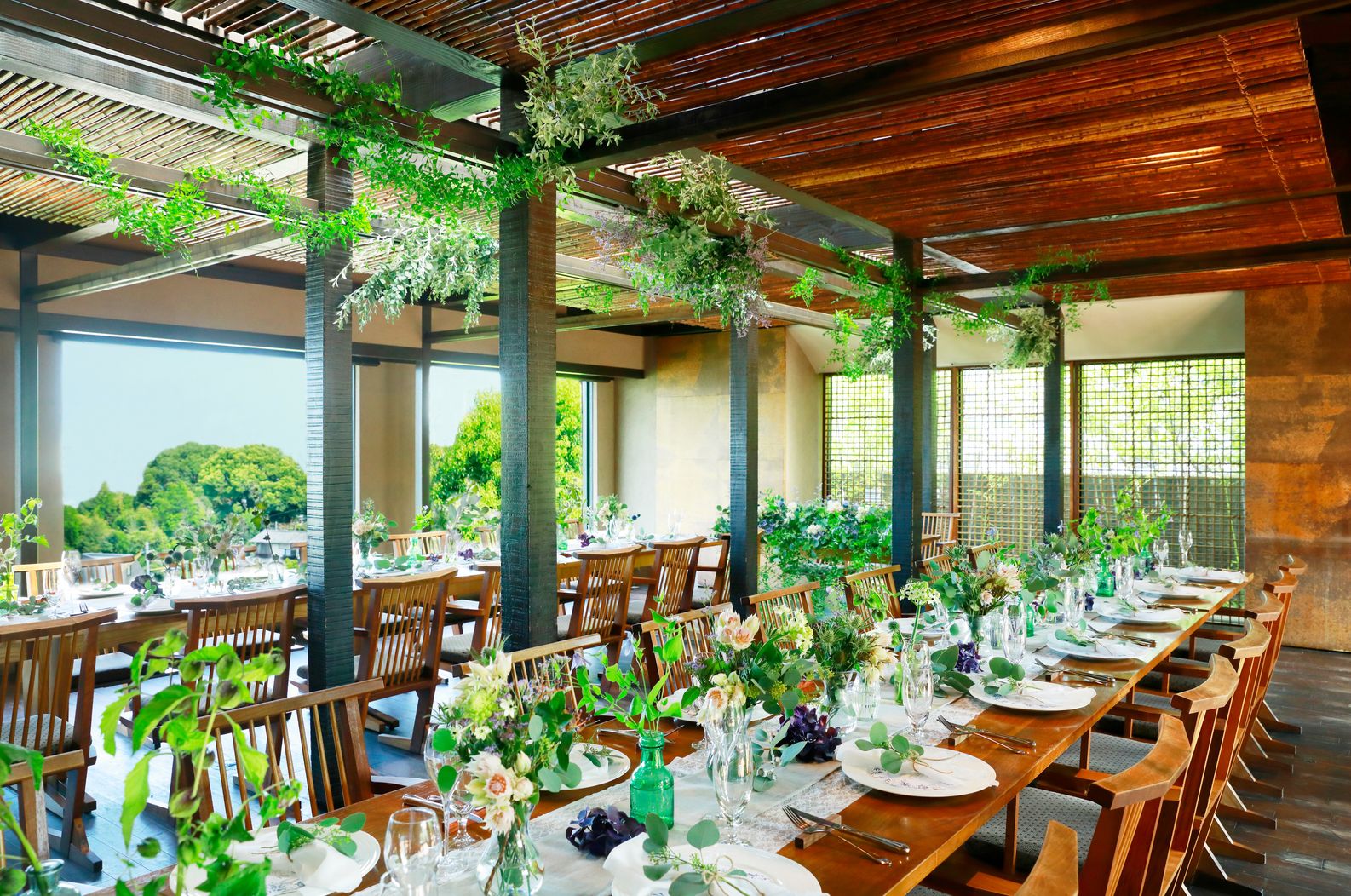 02.【開放的なパーティ会場】大きな窓から陽光が差し込む上質空間と風感じるガーデンテラス