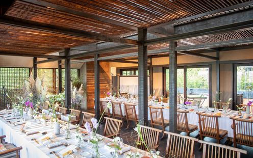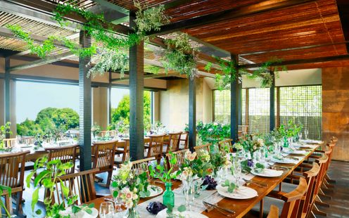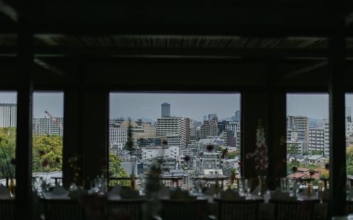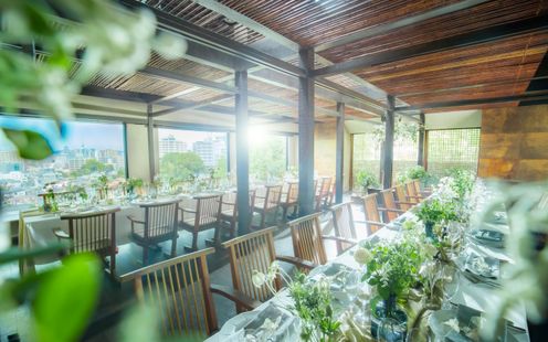 大きな窓と天窓から差し込む自然光が会場全体をやわらかく照らし、福岡市街の景色も一望できる開放感が魅力です。隣接するテラスではデザートビュッフェや乾杯などの自由な演出も楽しめ、ゲストと穏やかに過ごせます。パーティの進行もふたりの自由。会話を楽しみ、思い出を振り返りながら、ふたりの別荘に大切な人たちを招くようなアットホームなおもてなしが叶います。
