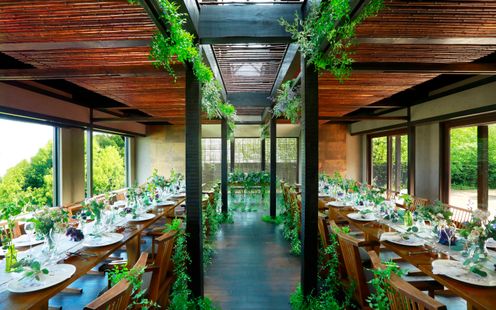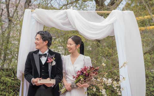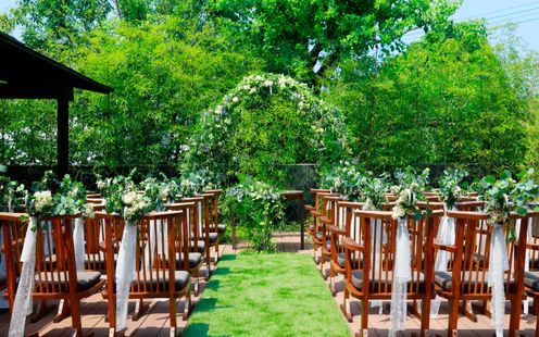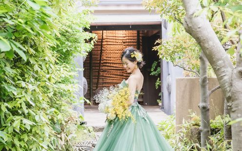 豊かな緑に囲まれた中庭で、開放感あふれるセレモニー。肩ひじ張らない自然体の姿で叶える誓い