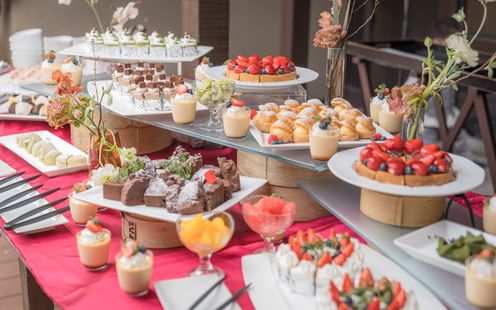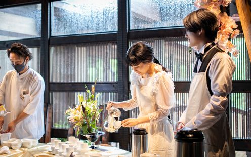 旬の食材を大切にし、和食とフレンチそれぞれの美しさを生かして仕立てる、和洋折衷スタイルの婚礼料理。コースの締めには、創業当時から愛される名物「土鍋和風おこげ」を提供。香ばしい香りや湯気、弾ける音が広がり、ゲストの五感を満たすフードパフォーマンスとしても人気です。併設する「西洋菓子工房IMURI」のパティシエが手掛けるスイーツやウェディングケーキは、季節のフルーツを使ったやさしい味わいが魅力。ガーデンやテラスでのデザートビュッフェも叶い、食を通してふたりらしいおもてなしが実現します。