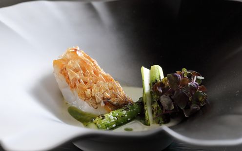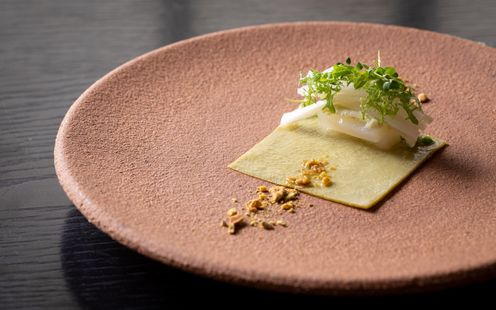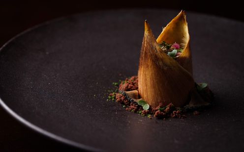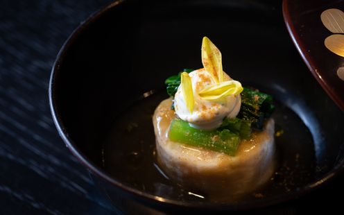 Watahanオープン当初から変わらず守り続けている特別な料理。器の中には苔や石、瑞々しい緑が丁寧にあしらわれ、Watahanの庭園をイメージ。季節ごとに表情が変わり、春はそら豆を使用。口に含めば、そら豆の青い香りがふわりと広がり、思わず笑みがこぼれるおもてなしの逸品です。