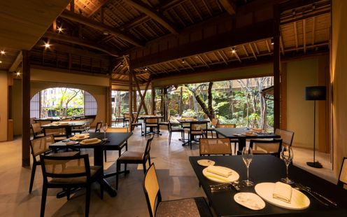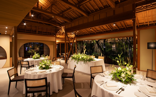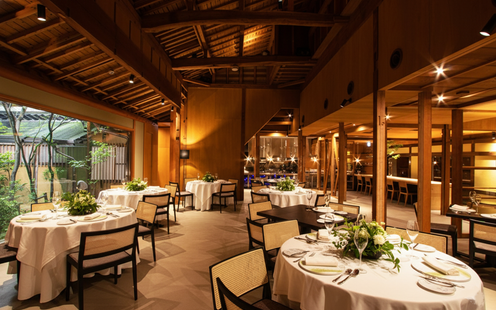 老舗料亭「和多伴」を受け継ぎ、それを綺麗に整えるのではなく、極限まで削ぎ落として見えてきたのは、削いだ傷や経年の跡に見る寂びの美意識。壁や天井、間仕切りを取り払い、豊かな庭園から注ぐ自然光が陰影を作り出し、日本の繊細な美意識と季節の移ろいを感じられる空間へと生まれ変わりました。庭園から伝わる光や季節の薫り、キッチンから伝わる美味しそうな音や熱、これまで以上にない開放感と一体感のある空間に、特別な時間が流れます。