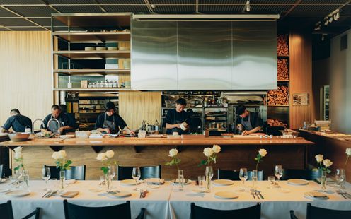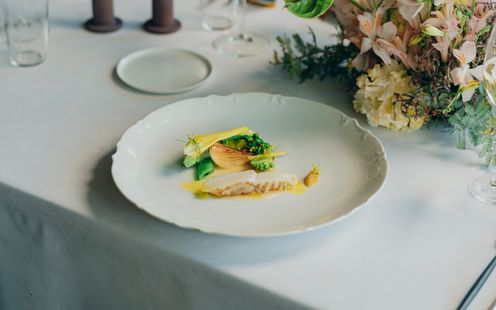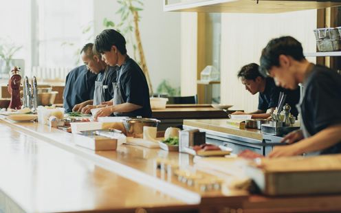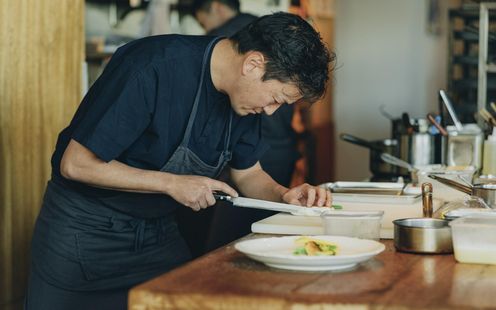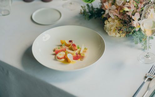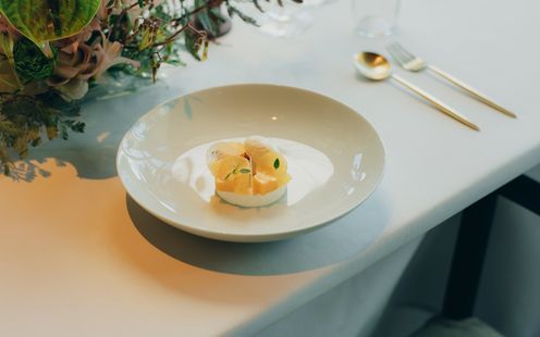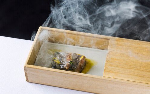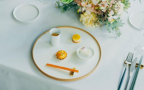 本場フランス・パリで国籍を問わずあらゆる国の人々に愛され、ミシュラン一つ星を獲得した「Sola Paris」。10年間パリの最前線で活躍した吉武広樹氏がオーナーシェフとして手掛ける料理がふたりの祝宴のテーブルを彩ります。九州で取れる季節ごとの旬の食材を使い、お祝いの日に華を添える料理を提供。たとえば、桐箱を開けると玉手箱のように燻煙の煙がふわり。白菜に包まれた牡蠣は薪で香ばしく炙られ、ジャガイモとネギのソースをまとっています。大間のマグロや霜降り和牛など希少食材ではなく、無理なく生産されている一般的な食材を活用し、プロの技でかつてないおいしさまで引き上げるのがSola流です。