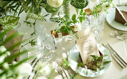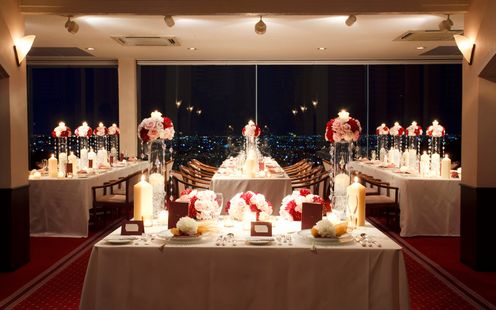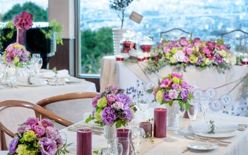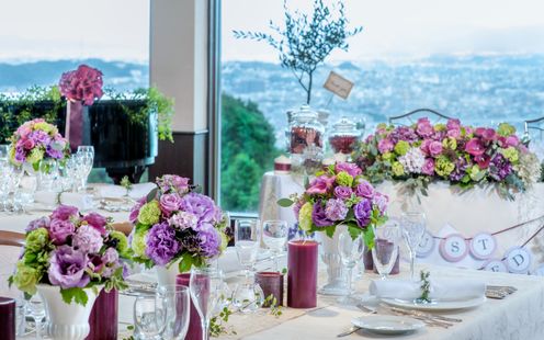 ふたりの憧れのスタイルを丁寧に聞き、専属フローリストがふたりらしいおもてなし空間を創り上げます。自然光が差込む上質空間を寛ぎに満ちた雰囲気にしてみては。また、ナイトタイムには美しい夜景が特別な1日を彩ります。