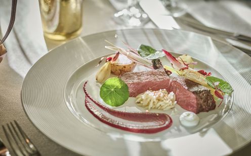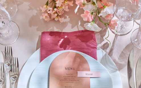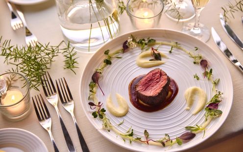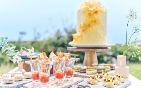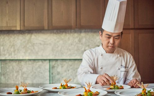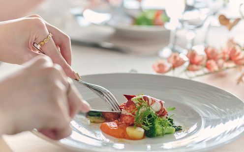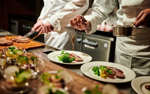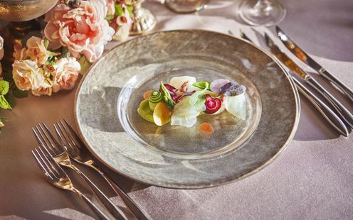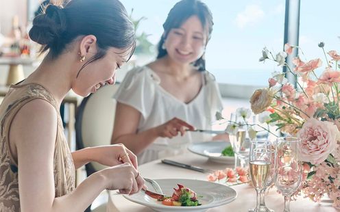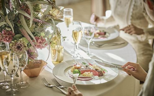 華やかなフレンチに日本の繊細さを取り入れた、独自の「フレンチジャポネ」を提供。地元・静岡の旬の食材を厳選し、味わいや香り、食感、温度にもこだわった調理法で仕上げます。会場隣接のキッチンからは、適温でゲストに届くフルコースが提供され、オリジナルメニューのアレンジも可能です。