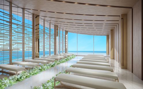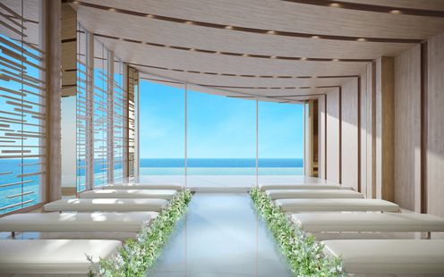 「波が穏やかに寄せる海」を意味するチャペル「Calme(カルム)」。目の前に広がるのは、一面の海と空。ガラスウォールが生み出すインフィニティ設計で、視界を遮るものがなく、ふたりと海がつながっているような神秘的な感覚に包まれます。木の温もりと光のきらめきが調和し、自然と一体になるような美しさを感じて。ホールやルーフトップからも、駿河湾や富士山の絶景が楽しめます。※全景 完成予想図