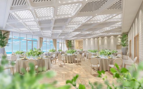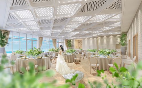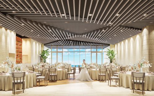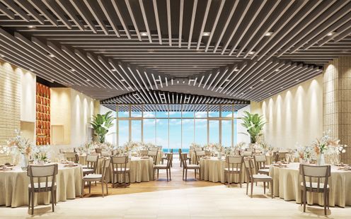 大きな窓から広がるのは、一面に続く海と空。自然光が差し込めば、ホワイトトーンの家具やシャンパンベージュで統一されたインテリアが柔らかく輝き、会場全体が美しい光に包まれます。幾何学模様にデザインされた天井は、海面のきらめきを映し取ったよう。海辺に降り注ぐ祝福の光を纏いながら、特別な時間を楽しんで。※全景 完成予想図