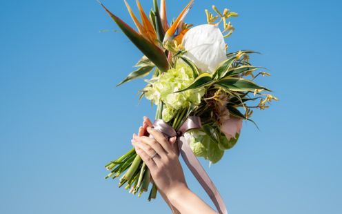 遮るもののない青空の下、大切な存在すべてに囲まれて浴びるフラワーシャワーは、一生忘れられない幸福の記憶となるはず。