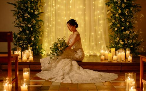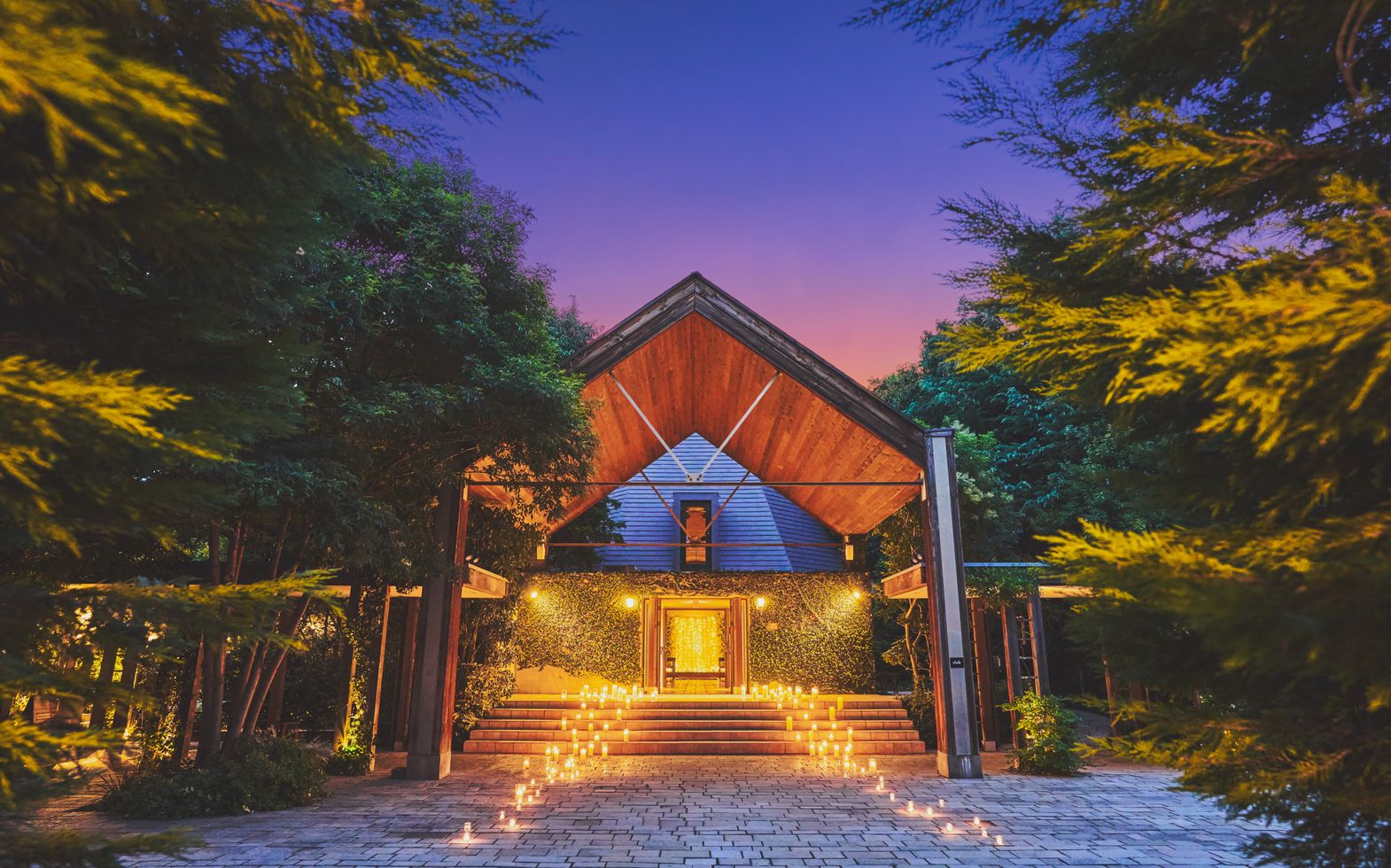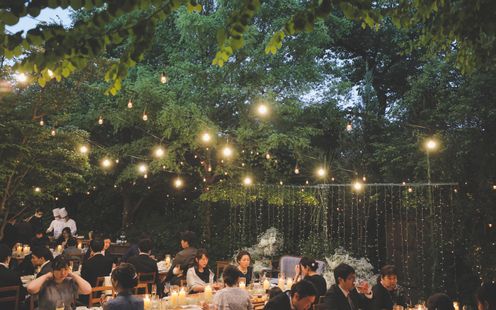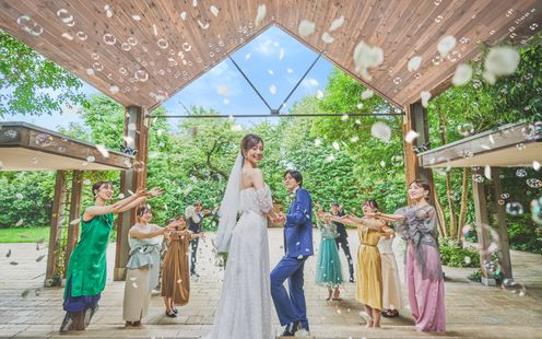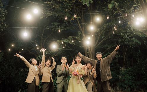 柔らかなライトに照らされる木々、揺れるキャンドルの炎、夕暮れで交わす誓いの言葉は、まるで映画のワンシーンのようなドラマチックな時間を紡ぎます。キャンドルに照らされながら舞い上がるバブルシャワーは、昼間とはひと味違う幻想的な美しさを演出。ライトアップされた空間で、ゲストと語らい、笑い合いながら、特別なひとときをお楽しみいただけます。