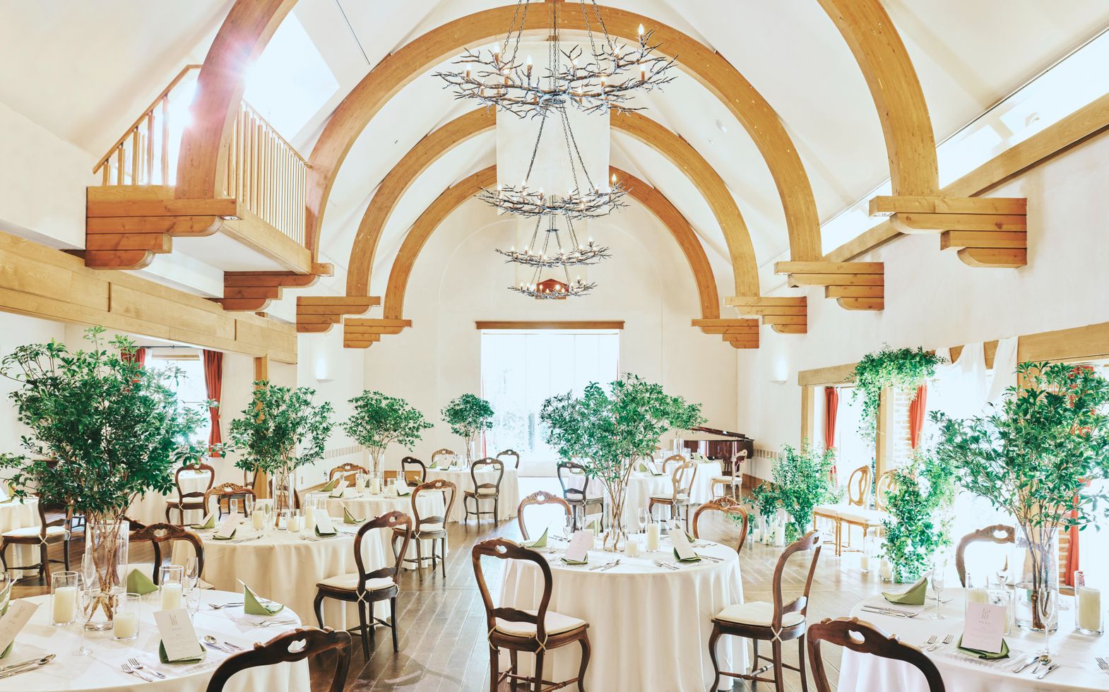 2階まで吹き抜けの高い天井に、特徴的なアーチ型の梁と桜をモチーフにしたシャンデリアが施されたナチュラルな空間。ガラス扉からは、シンボルの桜の木やカラフルな草花を眺められ、自由に行き来ができるガーデンは開放感も抜群です。広い空間でありながら横長の造りのため、親族席との距離が近いのも魅力。大階段からの再入場やグランドピアノでの生演奏、オープンキッチンなど、会場を沸かせる仕掛けも充実しています。プライベートガーデンでは乾杯からケーキカット、デザートビュッフェ、BBQなど多彩な演出でゲストとのリラックスしたひとときをお楽しみください。50名までならパーティの最初から最後までガーデンで過ごすALLガーデンパーティもおすすめです。