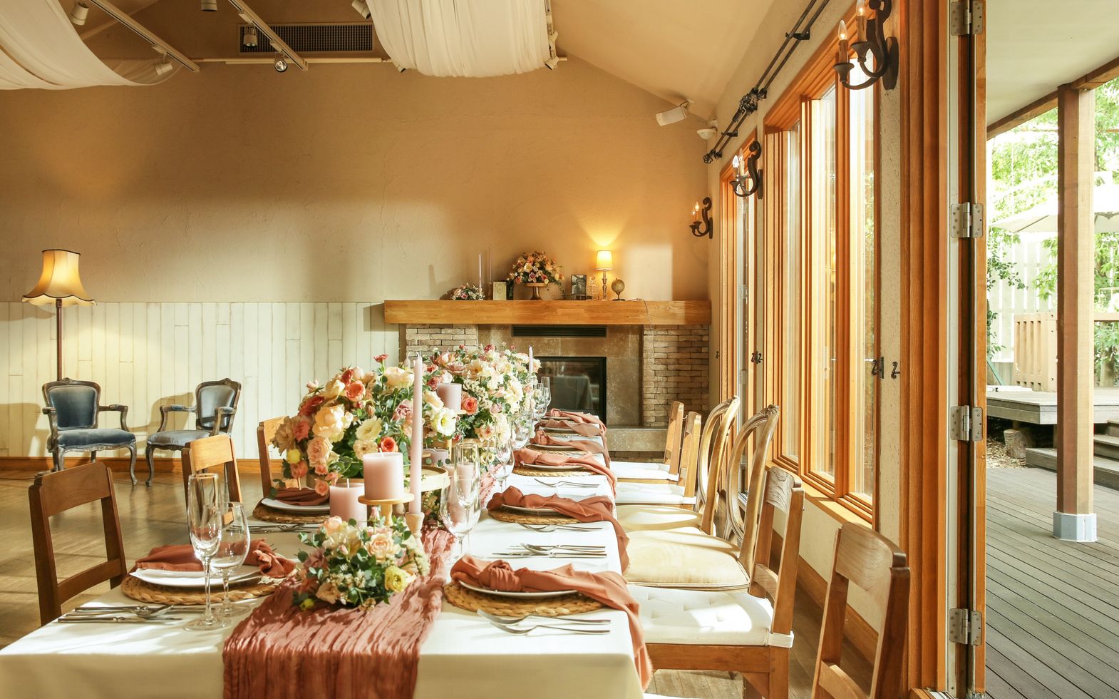 もう一つのシンボルツリー「椎の木」が見守るデッキテラスと、専用ガーデンを備えたアットホームな空間。『大切なゲストとどのように過ごすのか』を一番大切にしているからこそ、誰もが心地良く過ごしてもらえる空間に設えました。会場内には暖炉もあり、温もりあふれる雰囲気も。階段入場や、ガーデンを使った自由なパーティもすべて貸切で叶い、ゲストとゆっくり贅沢な時間を満喫できます。