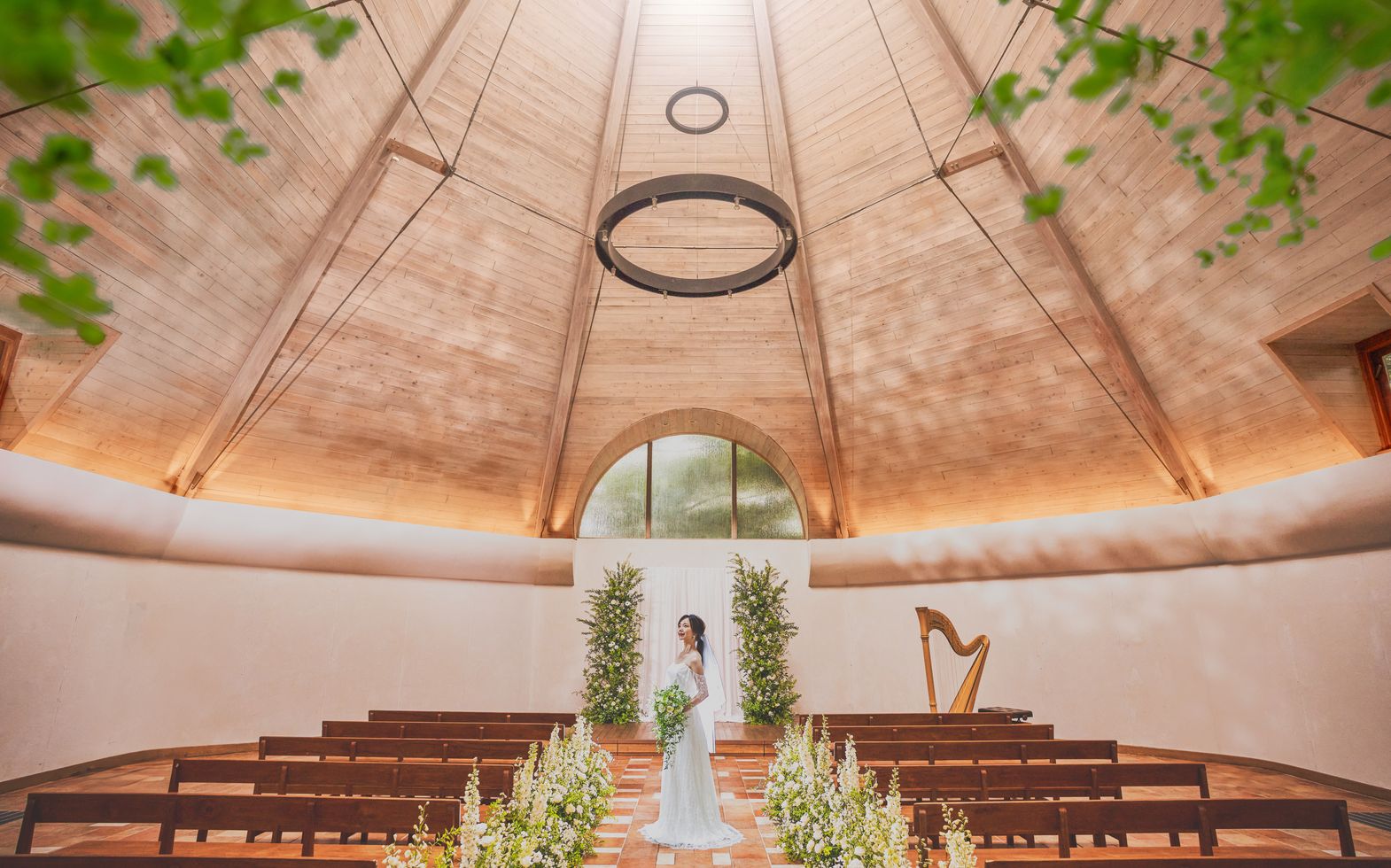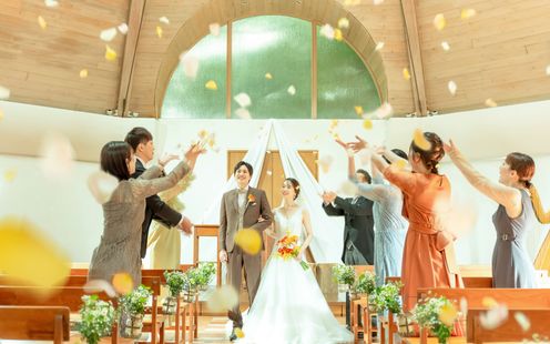 「森の音楽堂」をイメージしたチャペルは、天井高18mの開放感と、木の香りに満ちた温もりが広がります。チャペルでは珍しい円柱状の空間は、音が柔らかく反響する特別な設計に。ハープやチェンバロの生演奏や神父の言葉、そしてゲストの拍手が、まるで森の中で奏でられる音楽のようにふたりを優しく包み込みます。奏でる曲の希望があれば相談を。楽譜がある曲であれば対応可能ですので、おふたりの思い出の曲でのセレモニーが実現します。挙式後は、チャペル前のガーデンで色とりどりのフラワーシャワーやぬいぐるみトスも。幻想的なナイトウェディングも評判です。