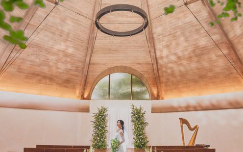 ナチュラルな雰囲気の中に、凛とした静けさが漂う音楽堂。自然と一体になる独立型チャペル