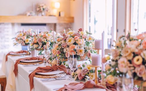 専属フローリストとプランナーが、ふたりの理想を丁寧にヒアリング。一輪一輪の花に想いを込めて、挙式会場やパーティ会場をトータルでコーディネートします。ウェディングケーキやテーブルクロスとの色合わせ、装花のデザイン、ボリューム、サイズまで、すべてがふたりの自由。パーティ会場のテーブルを彩るお花を、ゲストに選んでもらう「フラワービュッフェ」も大人気です。
