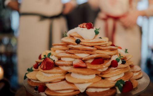 形や色、クリームの塗り方、会場のフラワーコーディネートとの相性など、この日の為だけに用意する、世界に一つのだけのオリジナルウェディングケーキを届けます。バームクーヘンやドーナツ、パンケーキを使ったウェディングケーキなど、自由なアレンジも可能。30種類もの豊富なアイテムで作るデザートビュッフェも人気です。