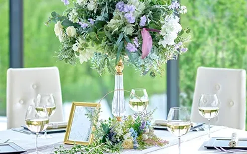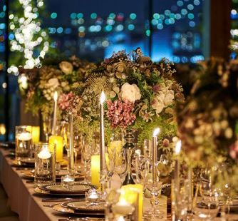 白を基調にした洗練空間は、どんなコーディネートも美しく映し出す“キャンバス”。装花やクロス、アイテムまで自由にアレンジでき、ふたりらしさを細部まで表現できます。シンプルだからこそセンスが際立ち、トレンド感あふれるお洒落なパーティが叶います。さらに夜には、東京湾のきらめく夜景を背景に、ランタンやランプ、キャンドルの光が会場を優しく包み込み、昼とは異なるロマンティックな雰囲気へ。ゲストの心に深く残る、印象的なひとときを演出します。
