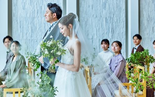 3面ガラス張りで天井高約10mにおよぶ、開放感あふれるチャペル「ラ・リュミエ」。目の前にレインボーブリッジと海を臨む抜群のロケーション!昼は空と海が広がる開放的な雰囲気を、夜は東京のイルミネーションが彩る幻想的な空間で感動のセレモニーが叶います。自然光を反射して虹色に輝くシャンデリア&15mのバージンロードを歩む花嫁が美しく映える空間。挙式スタイルは、教会式・人前式からお選びいただけます。(一部、完成予想図)