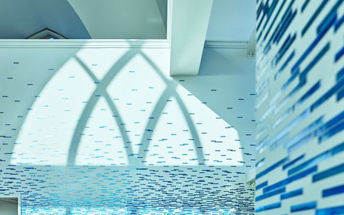 「ホテル シギラミラージュ」に併設された、宮古ブルーの海をイメージした専用エントランス付き独立型チャペル。3面の大きな窓から光が差し込む、海の景色と響き合う開放感あふれる空間。天井高約11m、バージンロード約8mの空間に、やわらかな光と青のグラデーションが広がります。自然と調和する空間で、心に残る誓いのセレモニーを。