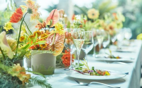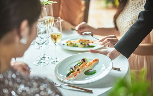 結婚式ではお二人が日頃お世話になっている方や、これからも縁を繋いでいきたい大切な方々が一堂に会します。そんな皆様に、「おいしかった」だけではなく、その先の感動をお届けしたいと思っています。これから運ばれるお料理への期待感を高めていただく色とりどりの前菜から、結婚式の余韻に浸っていただくデザートまで、コースをひとつのストーリーとしてお愉しみください。