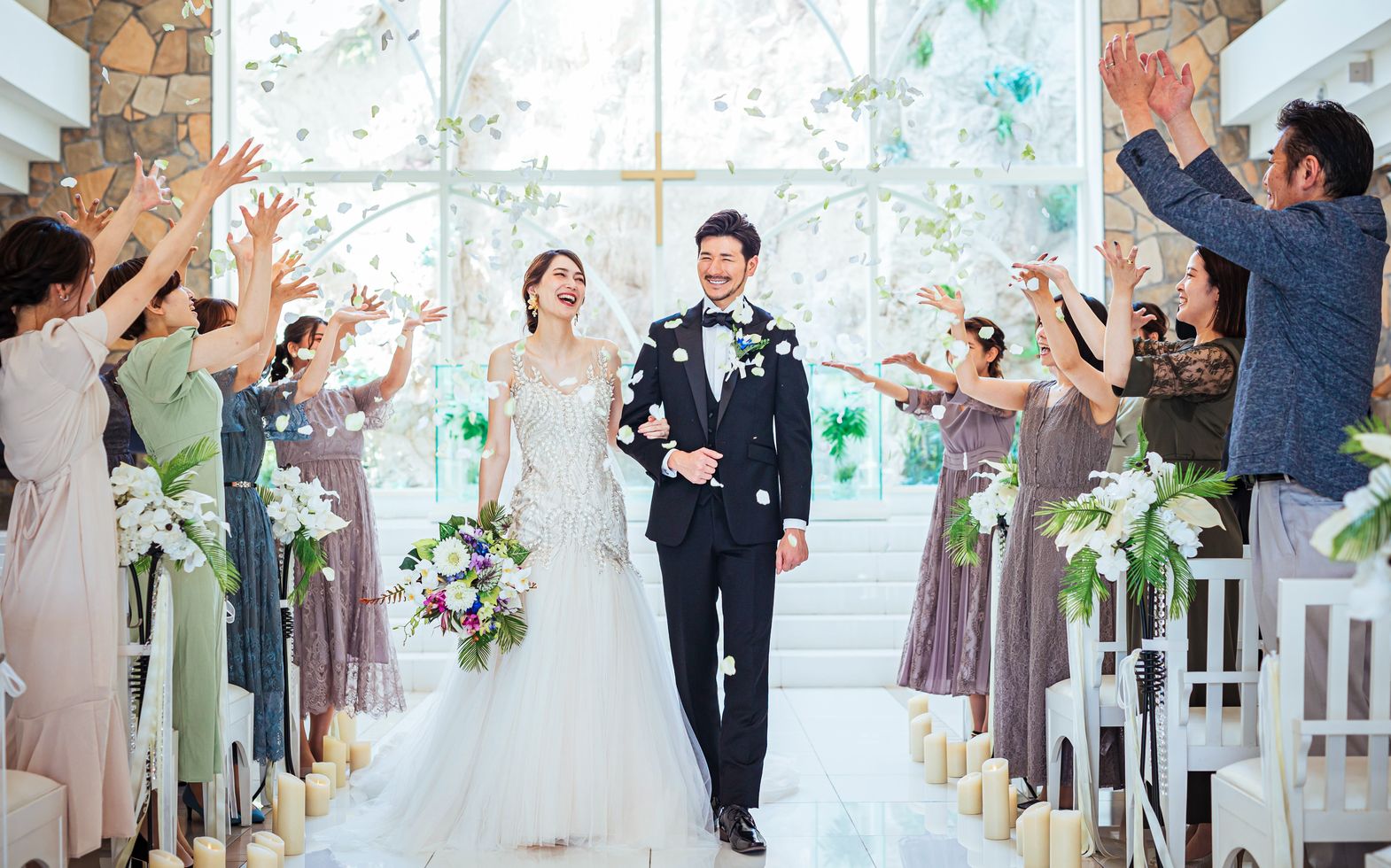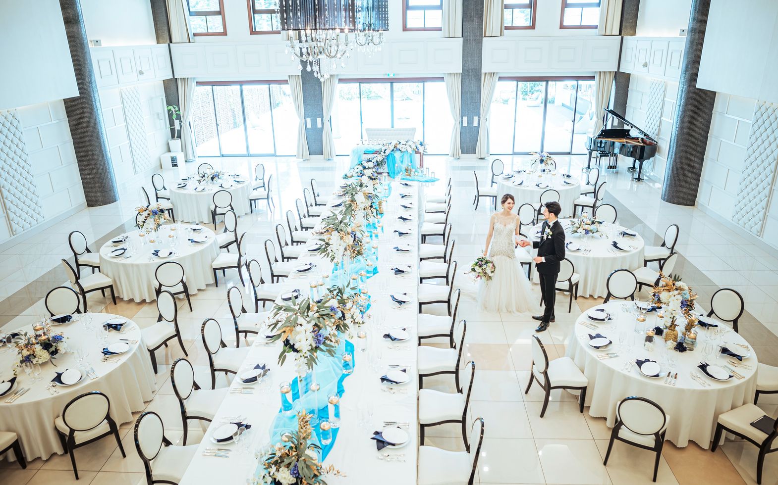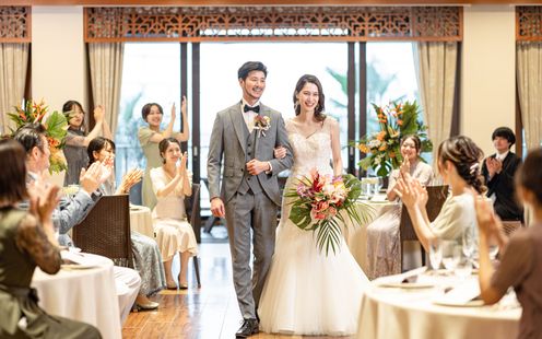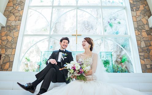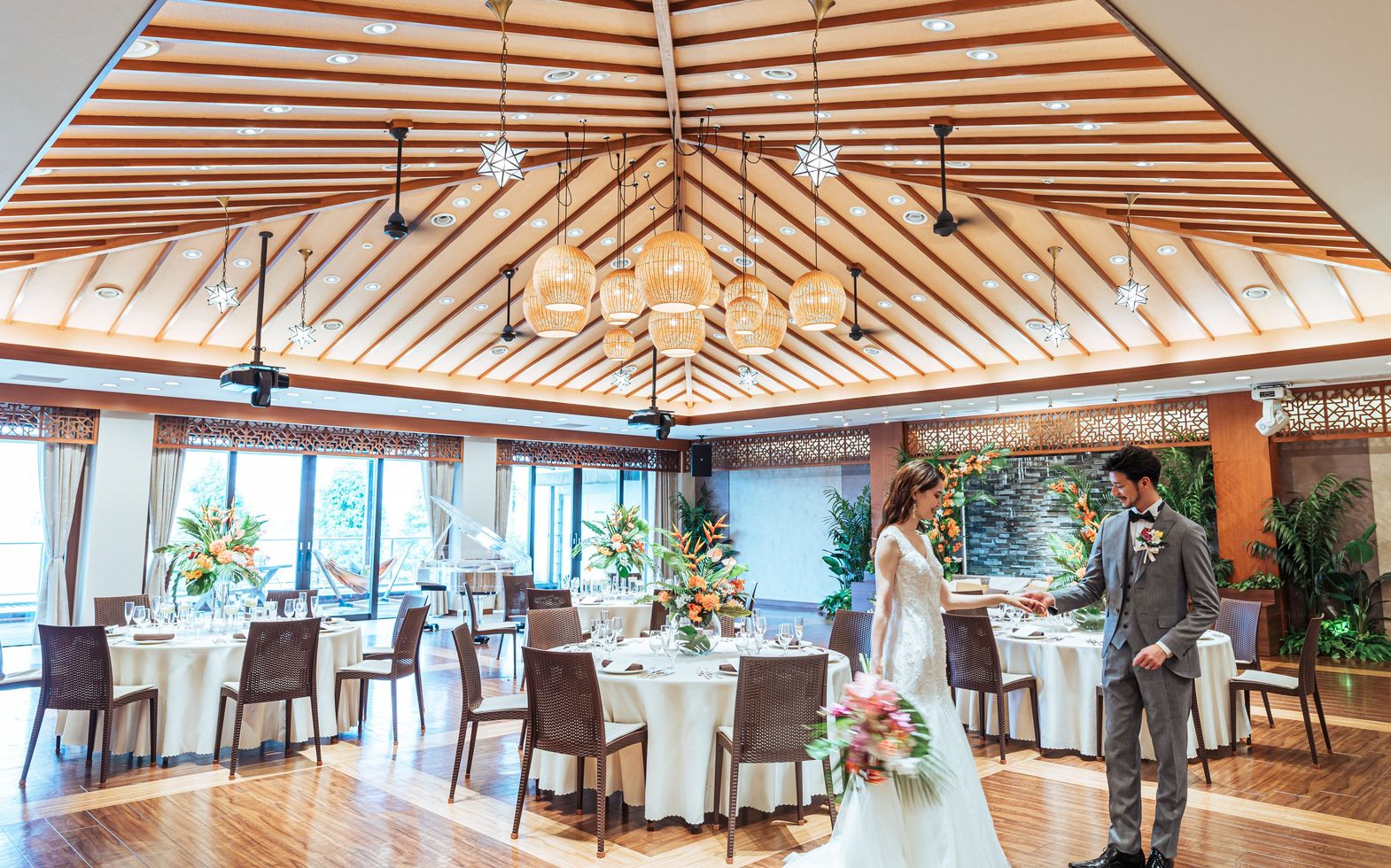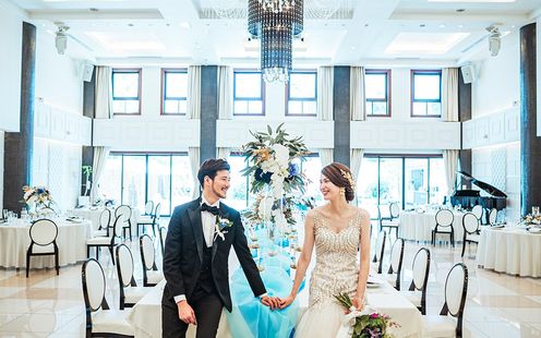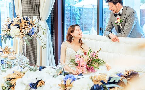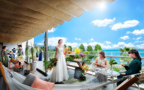 自然光を活かしたリゾート感あふれるコーディネートが人気。ふたりらしい雰囲気作りをお手伝い