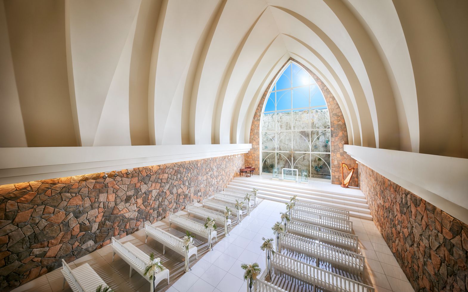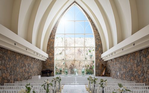 モルディブの島々で使われている大きな三角形の帆を持った船をドーニーといいます。チャペルに差し込む太陽光が映し出すガラスの紋様は湖にうかぶ帆船(ドーニー)をイメージ。石の壁に燦々と差し込む太陽の光と、正面のガラスの向こうにキラキラと輝きながら流れる水は、ふたりの幸せを優しく照らします。