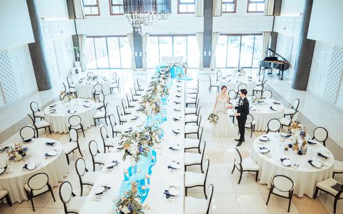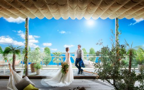 天井高12m、県内有数のスケール。青空のもと行うアフターセレモニーは開放的なレイクビュー