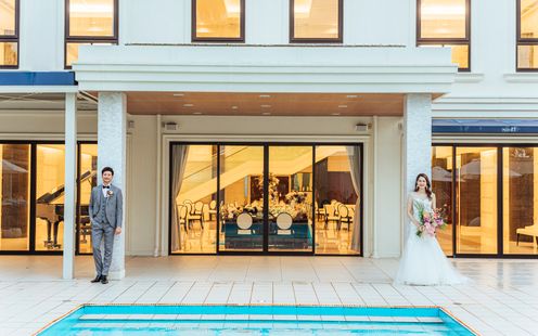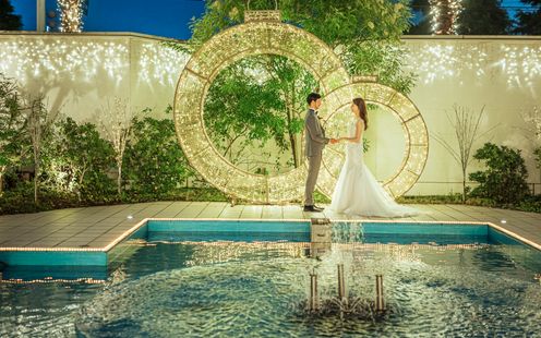花の香りがあふれる緑豊かなガーデンとプールに囲まれたプライベート感を充実させたバンケット。階段からの入場や、ガーデンでの演出などサプライズいっぱいのパーティが楽しめます。