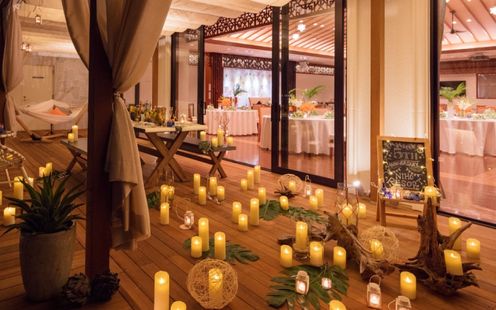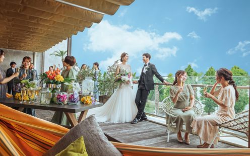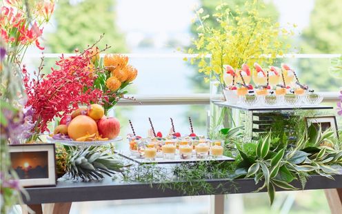 レイクビューのウッドテラスや、南国ムードあふれるプールではウエルカムパーティをはじめ、ガーデンからの入場、デザートビュッフェなどイン&アウトと自由に行き来して動きのあるパーティが叶えられます。ナイトタイムにはキャンドルを灯して湖からの心地よい風を感じながらカクテルパーティをお楽しみいただけます。