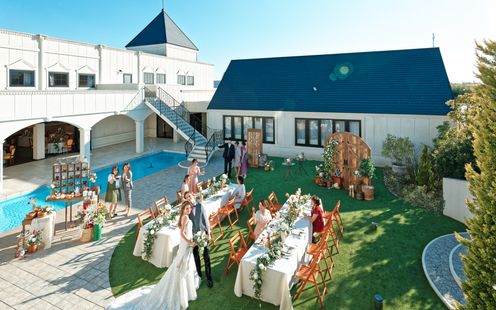 開放感あふれるプール付きのガーデンでは、ゲストとアットホームなひとときを過ごせます。昼は緑と陽光に包まれたナチュラルな空間で、ガーデンビュッフェなどの演出が人気。夜は打ち上げ花火やキャンドルの灯りが幻想的な雰囲気を演出し、ナイトウェディングにもぴったり。貸切だからこそ、ふたりらしい自由なパーティが叶います。