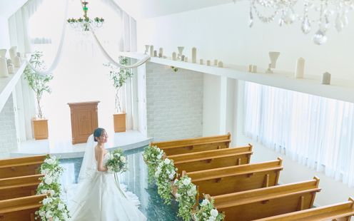 三方向の窓から柔らかな陽光が降り注ぐ、白を基調とした清楚な空間。緑と木目の調度が調和し、ナチュラルで温かみのある雰囲気を演出します。煌めくシャンデリアが特別な誓いの瞬間をやさしく彩り、アットホームな挙式が叶います。