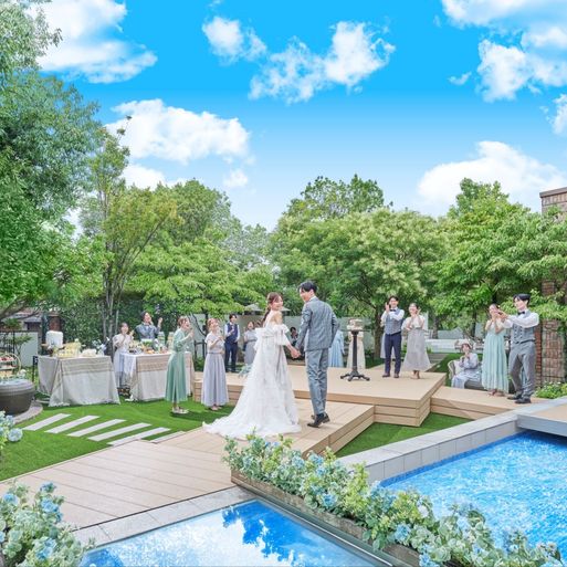加えて好きなポイントは高砂の正面が全面ガラス張りで、外にはテラスやソファー席、プールのような水場があり、開放感がとても良いところです!オープンキッチンも会場内にあるので、料理している姿も楽しめたのではないかなと思います。