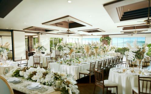 。どこか 懐かしいオリエンタルテイスト漂う上質空間で、目前に広がる雄大な海や緑を見晴らしながら、優雅に寛ぐひとときを。会場併設の広いリビングルームや、潮風がそよぐデッキテラスもおふたりとゲストで独占。ジャズの生演奏など特別感を添えた演出が、忘れられない時間を彩ります。