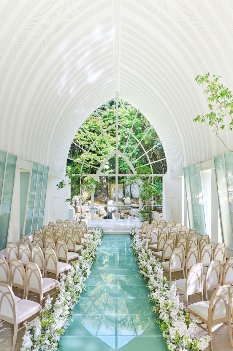 02.<独立チャペル>象徴的な滝が流れる光と緑に包まれた会場。挙式後はガーデンでの演出も