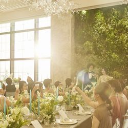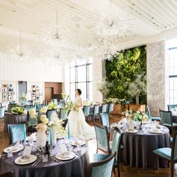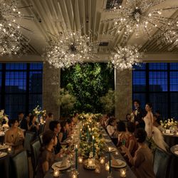ニューヨークビンテージをコンセプトにしたメインバンケット<W+ish>。扉を開けると映画のワンシーンのような華やかな世界が広がります。「アーバンアウトドア」という表現がぴったりの開放感あふれるこの空間は、個性豊かなアートやシャンデリアが、甘すぎない大人のエレガントさを創出しています。ナイトウェディングなら、少しゴージャスな“晩餐会”スタイルもおすすめ!