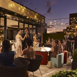 最上階にたたずむアフターセレモニースペース<az well>。ここは二次会専用の“隠れ家的スポット”。同じ施設で二次会ができるのでゲストへ移動の負担も少なく、結婚式場なので、音響や映像施設も充実。披露宴とは異なるリラックスしたひとときをお過ごしいただけます。