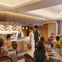 大人の遊び心溢れる上質なおもてなしのひとときを堪能できる空間。アイランドキッチンで繰り広げられる、シェフの料理パフォーマンスを目の前で体験できるのが魅力です。カジュアルなレストランスタイルで親族や親しい方を招く家族挙式スタイルにも最適!