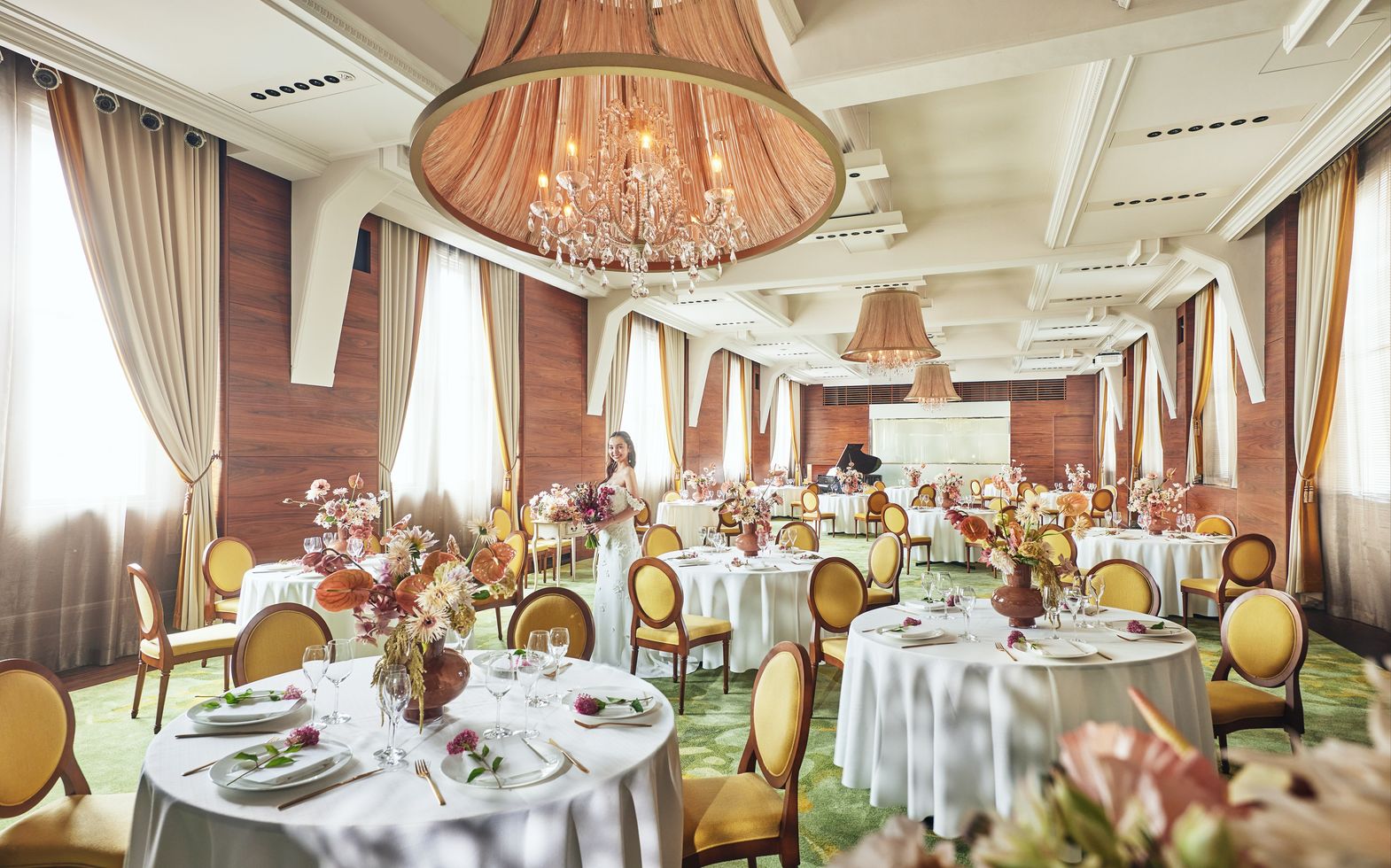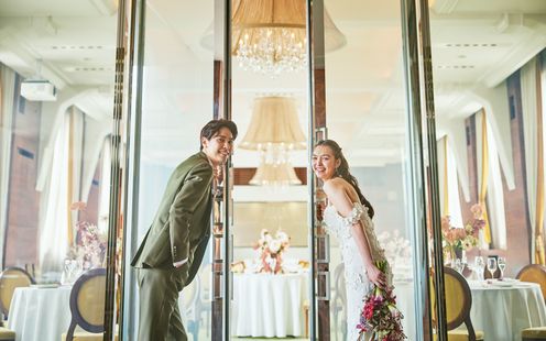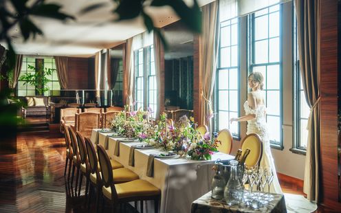 4.5mの高い天井に輝くシャンデリア、明治の面影が残る歴史建築の品格。それぞれ、結婚式らしい華やかさと落ち着きを同時に感じられるパーティ会場です。洗練されたモダンデザインが美しく、上質で大人のパーティが叶う場所。ガラス窓から差し込むたっぷりの温かい陽光は、おふたりの祝宴に彩りを添えます。このレトロモダンな空間を貸し切って、非日常感あふれる贅沢な時間を堪能してください。