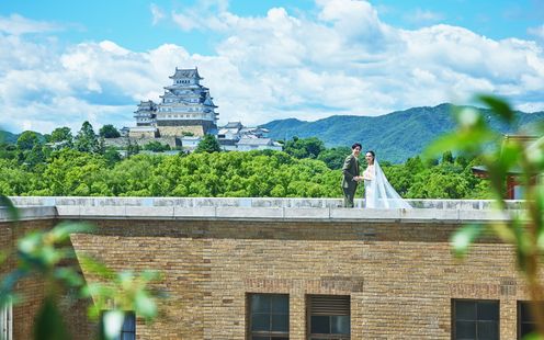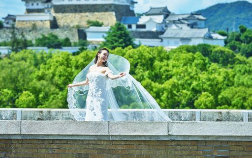 チャペルへと続くガーデンでは、挙式後のアフターセレモニーをお楽しみいただけます。ゲストと一緒に写真を撮ったりドリンクやお食事を楽しんだりと、プライベートな空間で思い思いの時間をお過ごしください。またフォトスポットとしても人気の場所。屋上ガーデンの姫路城を独占する圧倒的なロケーションでの撮影は、姫路モノリスならではの特別なショットです。