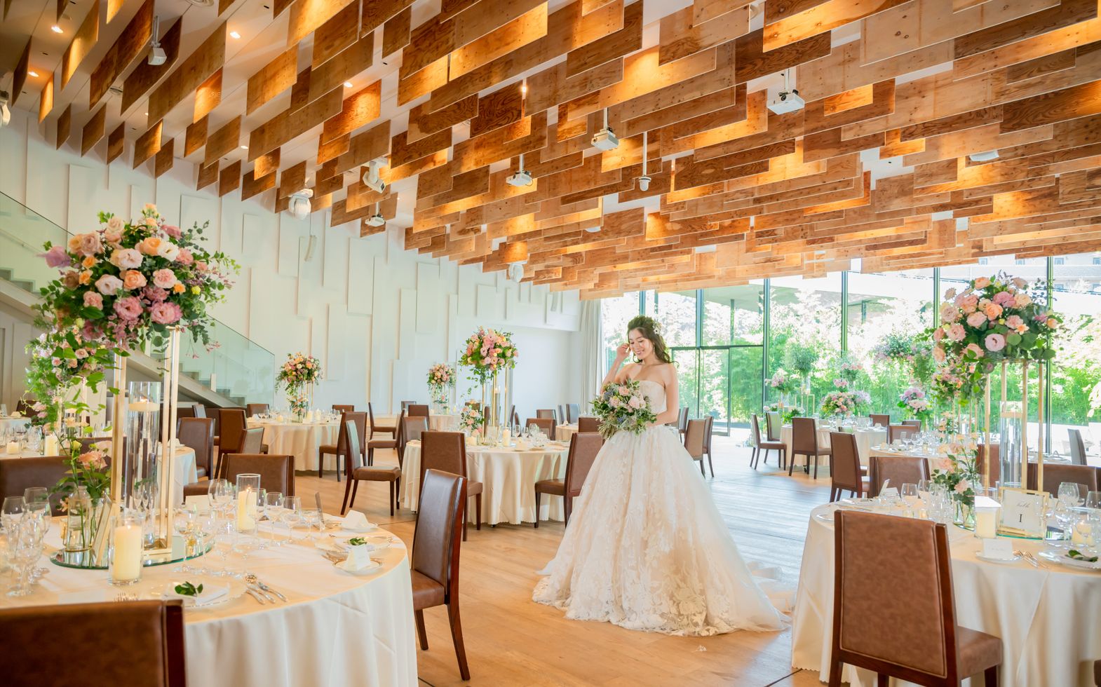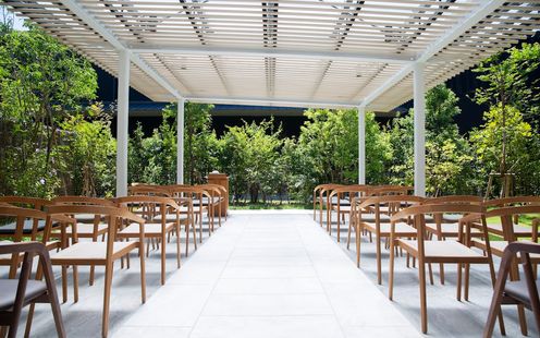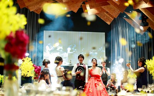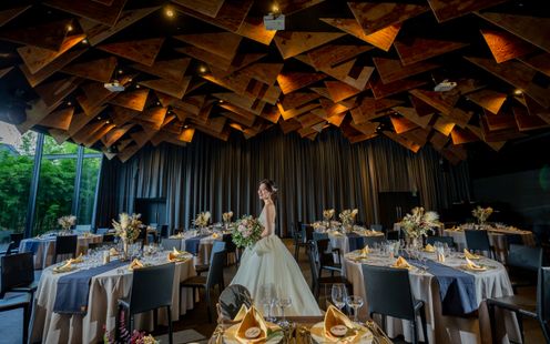 世界的建築家・隈研吾氏が手がけた洗練空間。ブラウンを基調としたシックな内装と、上質な家具や装花が非日常を演出します。艷やかな和装にも映える落ち着いた会場では、花火を使った演出など、おふたりらしいスタイルも自由自在。上品でオリジナリティ溢れるコーディネートが叶います。シンプルながら計算し尽くされた空間で、大人の優雅な祝宴を!