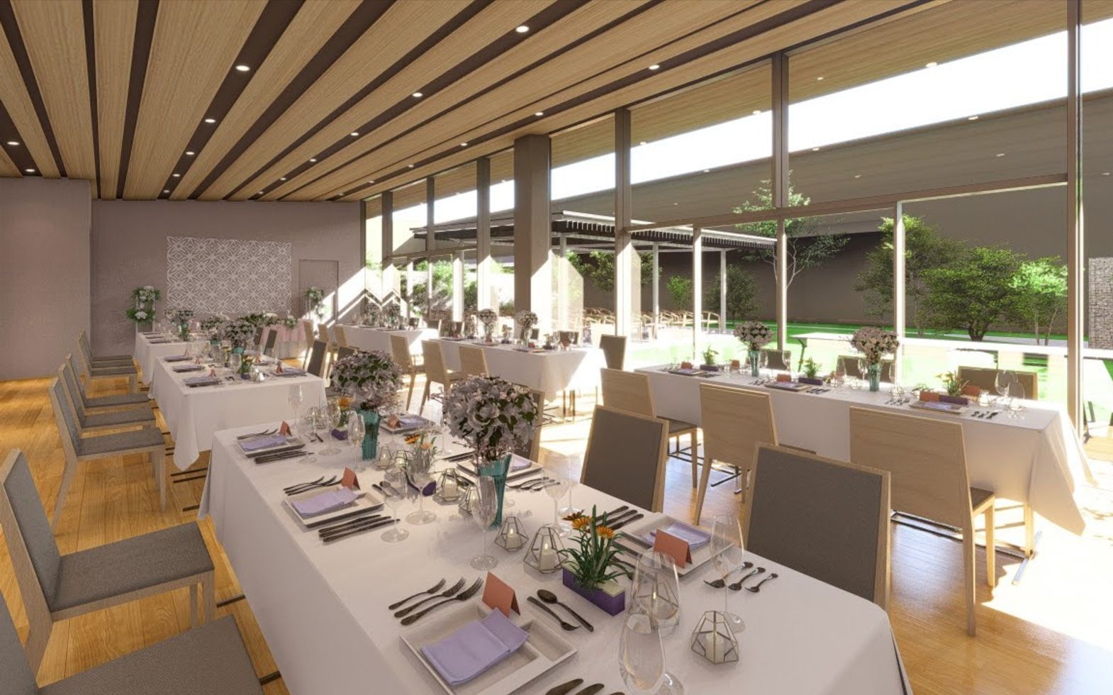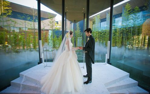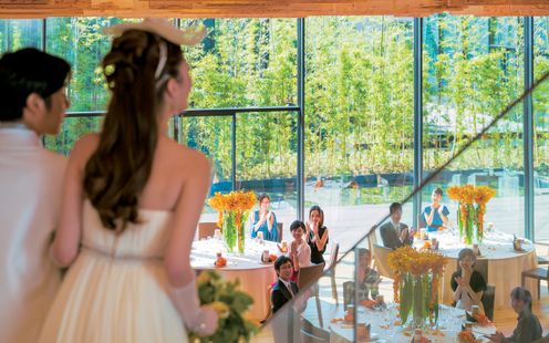 180°ガラス張りのチャペルは、自然と調和した神聖な空間。竹と水の中庭を望み、晴れの日は陽光が差し込む明るさ、雨の日はしっとりと幻想的な雰囲気に。和装にも映える緑に囲まれた舞台での人前式や、雪が舞うロマンチックな演出も可能です。夕刻にはライトアップされ、ゲストを非日常の世界へと誘います。オリジナル映像の上映にも対応し、おふたりらしい挙式を叶えます。