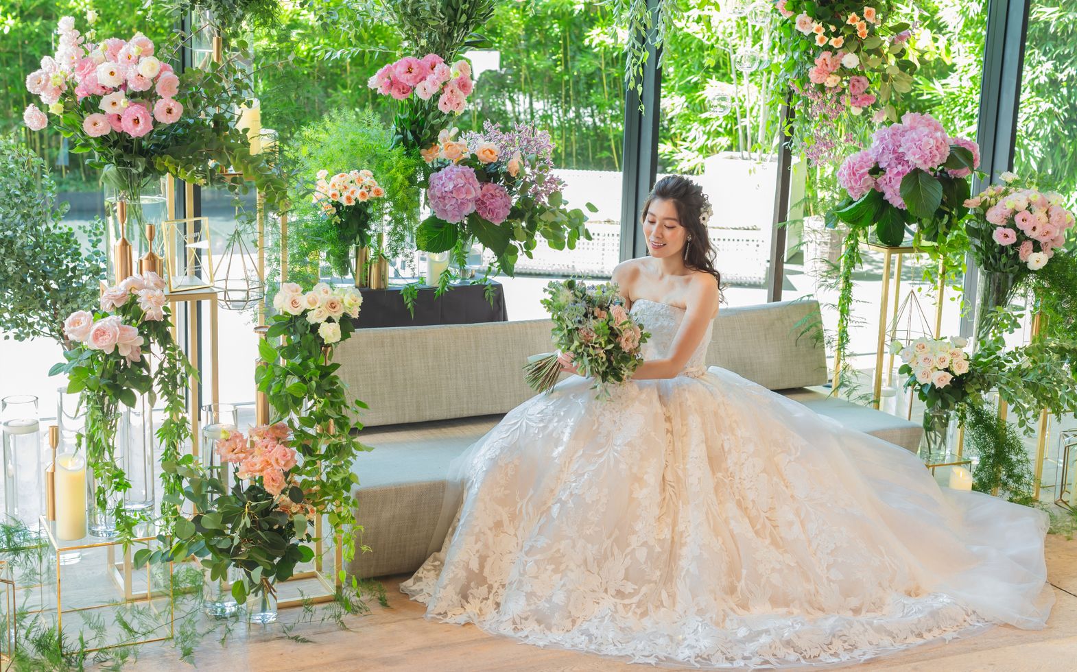 静けさの中に凛とした気配が漂う、竹を主役にした特別なガーデン。風にそよぐ竹の葉音、水面に映る緑の揺らぎが、まるで別世界に訪れたかのような非日常感を演出します。和装との相性も抜群で、前撮りやウェルカムパーティ、ナイト演出にもぴったり。昼は自然光に照らされて爽やかに、夜はライトアップで幻想的に——時間ごとに表情を変える、美しき竹の庭が、ふたりの特別な一日を彩ります。