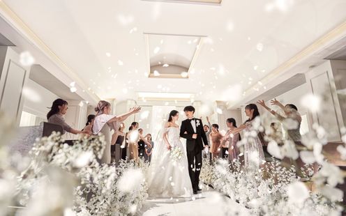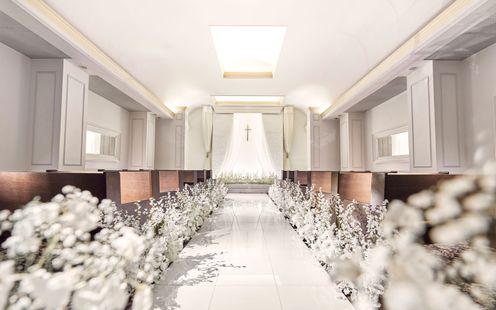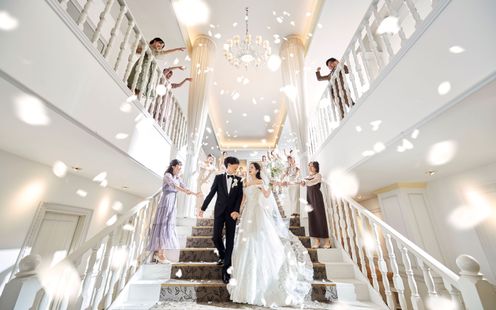神聖な雰囲気の真っ白なチャペルではキリスト教式のほか人前式も執り行うことができます。ゲストがゆったり列席できるようチェアはソファタイプのものをご用意。厳粛ながらもリラックスしたセレモニーを。挙式後は館内の大階段でのアフターセレモニーも叶います。