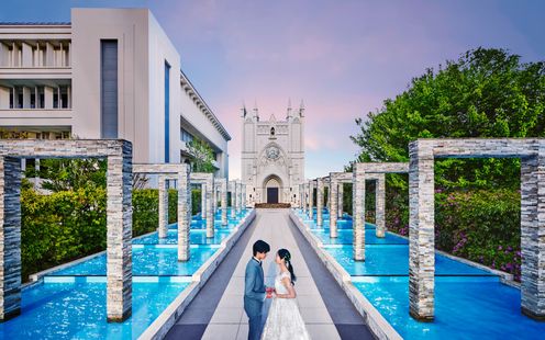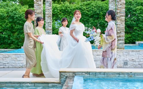 大聖堂を出るとすぐに広がるアフターセレモニースペース。「空」、「緑」、「水」が彩るリゾート地さながらの開放感あふれる魅力のスペース。ゲストの笑顔と歓声に包まれて生涯忘れられない幸せなひとときを。