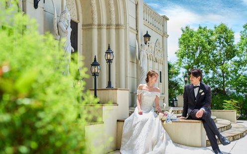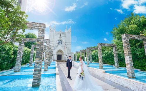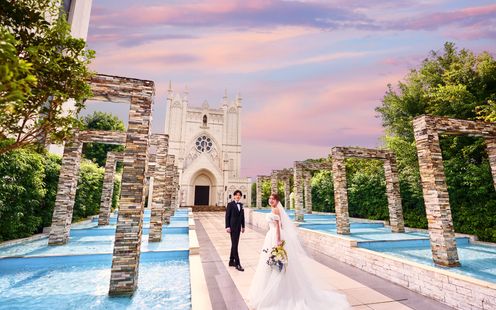 ルーベンスの絵画を愛したネロ少年とパトラッシュ。その感動的なストーリーの舞台、ベルギー・アントワープの「ノートルダム大聖堂」がこのカテドラルのモチーフ。天井高・バージンロードとともに20mと壮大なスケールを誇る大聖堂です。180年もの時を刻んだアンティークのステンドグラスが印象的。パイプオルガンの生演奏や聖歌隊のコーラスがおふたりの記憶に残るセレモニーをよりいっそう引き立てます。挙式後は水、光、緑が彩る青空にもとで盛大にアフターセレモニーをお楽しみいただけます。