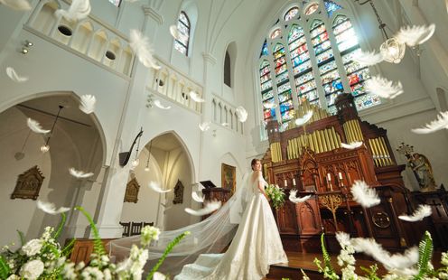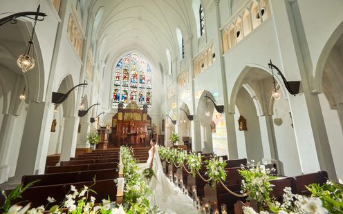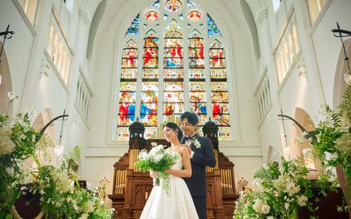 180年の時を経て幻想的な輝きを放ち続けるアンティークステンドグラスのもとで感動挙式