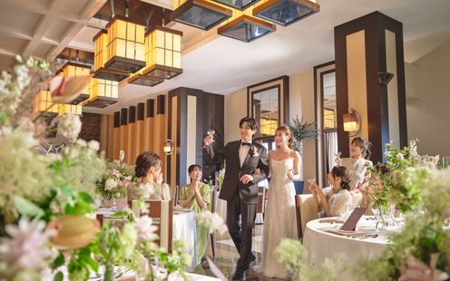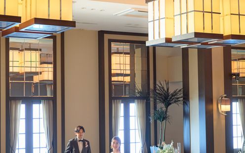 奥ゆかしく厳かな佇まいの中にもモダンな意匠をとりいれた会場は、花嫁の美しく清らかな白無垢姿を一層引き立てます。披露宴でのお色直しでドレスを着て雰囲気を変えた演出ができるのも神前挙式の魅力です。