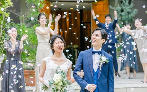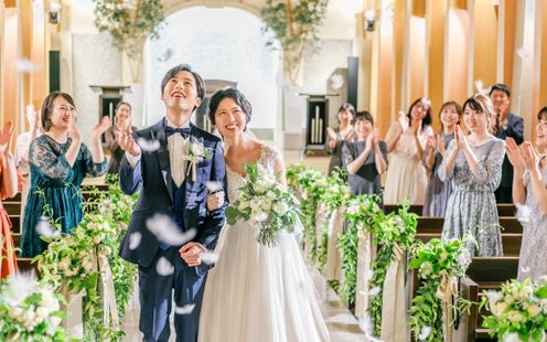 チャペルの大扉から一歩外に出ると、そこには都心とは思えないほどの緑豊かなガーデンスペースが広がります。ここではフラワーシャワーや写真タイムなどの演出を楽しんで。感動的な挙式の雰囲気とのギャップは、ゲストと距離がグッと縮まるきっかけに。夕暮れ時の、昼間と違ったロマンチックな雰囲気も魅力的です。